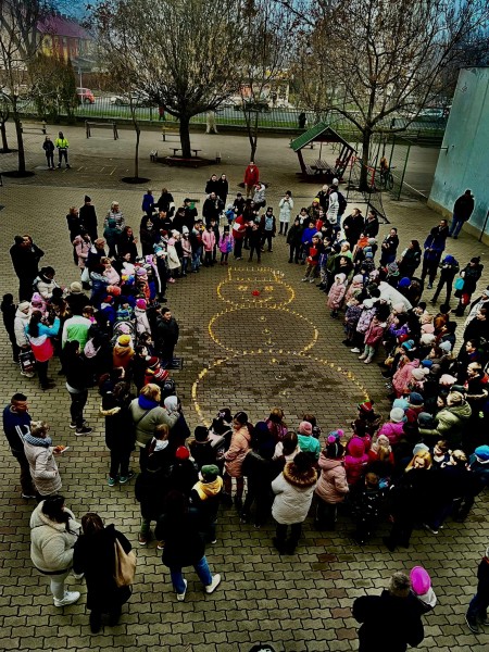 Több száz mécses fénye borította tegnap délután a Várkonyi Iskola Széchenyi úti épületének udvarát. A gyerekek, szülők és pedagógusok együtt raktak ki a mécsesekből egy hóember alakzatot, majd körbeállták és együtt énekeltek.