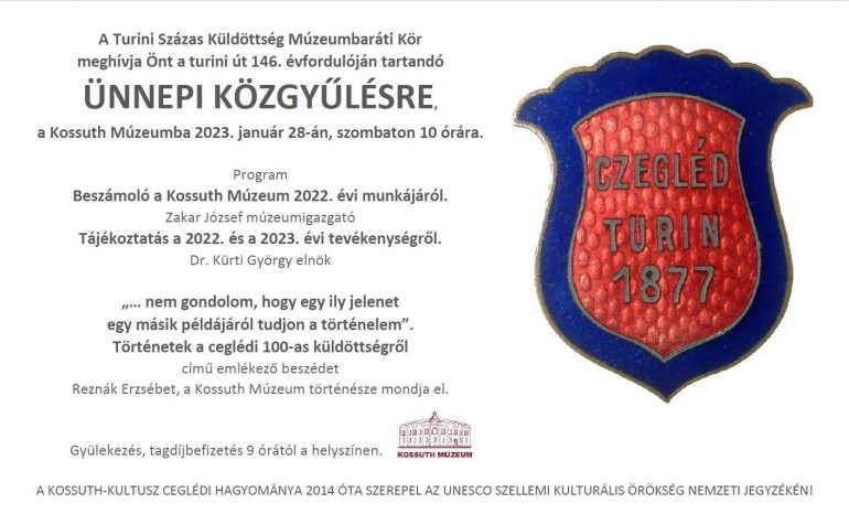 A Turini Százas Küldöttség Múzeumbaráti Kör meghívja Önt a turini út 146. évfordulóján tartandó ünnepi közgyűlésre, a Kossuth Múzeumba 2023. január 28-án, szombaton 10 órára.