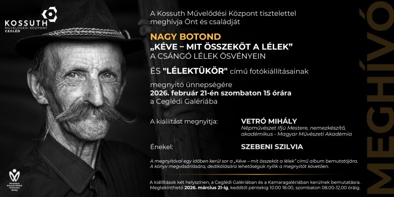 A Kossuth Művelődési Központ tisztelettel meghívja Önt és családját Nagy Botond "Kéve - mit összeköt a lélek" a csángó lélek ösvényein és "Lélektükör" című fotókiállításainak megnyitó ünnepségére 2026. február 21-én (szombaton) 15 órára a Ceglédi Galériába.