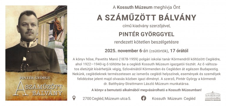 A Kossuth Múzeum meghívja Önt "A száműzött bálvány" című kiadvány szerzőjével, Pintér Györggyel rendezett kötetlen beszélgetésre 2025. november 6-án (csütörtök) 17 órától.